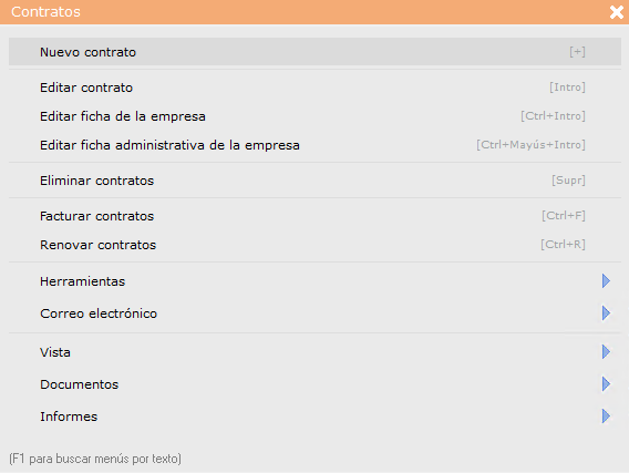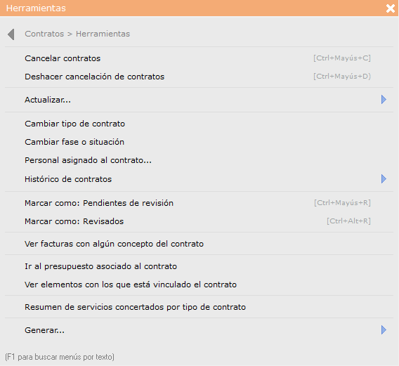 En este menú encontramos las herramientas más importantes que nos permitirán ejecutar acciones relacionadas con la gestión y edición de los contratos, la facturación de los mismos o la generación de elementos relacionados a dichos contratos. Pasamos a detallar estas herramientas.