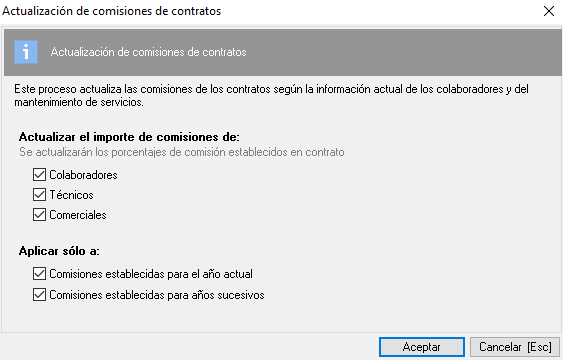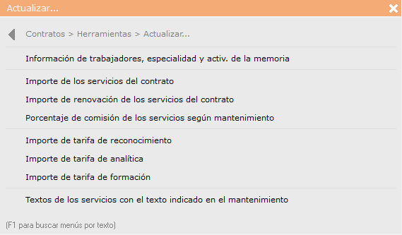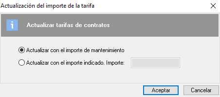 Aplica al contrato los importes actuales definidos en el mantenimiento de servicios, sustituyendo los valores que pudieran haber quedado desactualizados. Siempre que el contrato no tenga facturación, parcial o total, podrá usar esta herramienta que afectará a los importes indicados en el contrato para su facturación, incrementando o reduciendo con el porcentaje indicado.