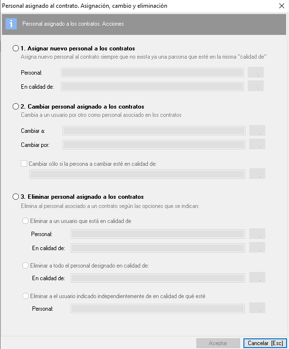 Esta opción permite modificar el personal de la organización vinculado a un contrato existente. La asignación de personal identifica a los usuarios responsables de la gestión o prestación del servicio asociado al contrato, por lo que su actualización resulta necesaria cuando se producen cambios en el equipo de trabajo, reasignaciones internas o sustituciones.