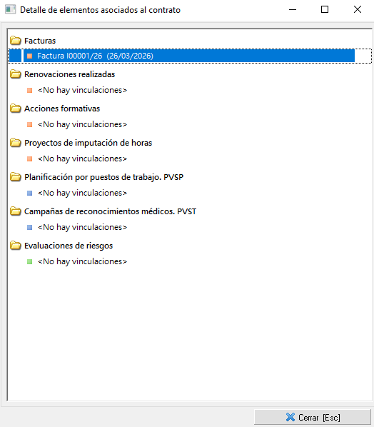 A través de esta función, el usuario obtiene una visión de conjunto de todos los registros vinculados al contrato, como Facturas, renovaciones, acciones formativas, PVSP, campañas de reconocimientos PVST, Evaluaciones de riesgos y proyectos de imputación de horas.