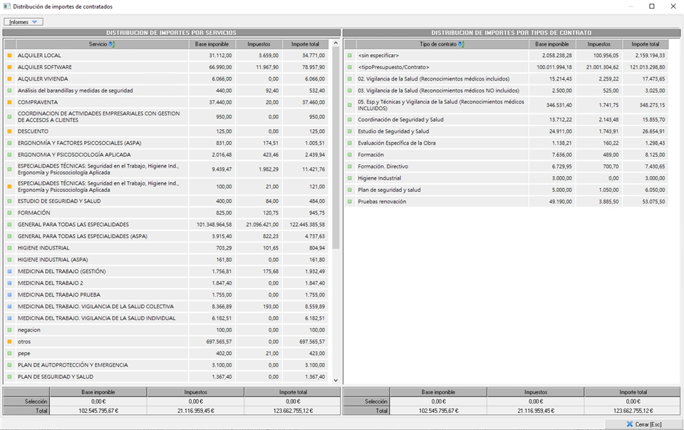 Listado de todos los tipos de contrato identificados en los contratos con los importes totales por tipo.