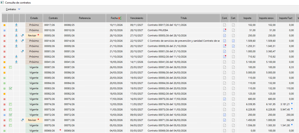 En el listado de contratos encontrarémos toda la lista de los contratos. Estos con diferentes iconografias y colores según su estado y procesos de facturación.