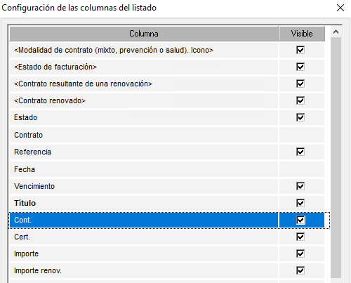 En este menú de configuracion de las oclumnas en el listado de contratos podrémos seleccionar las columnas de información que más se adapten a nuestras necesidades así como el orden. Para ordenarlas, simplemente tendrá que seleccionar 1 campo haciendo clic y posteriormente presionar la tecla Ctrl + Arriba/abajo para ordenarlas.