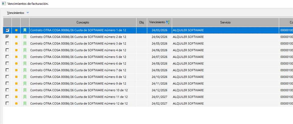 Inicia el proceso de facturación del contrato seleccionado, generando los vencimientos y documentos de factura correspondientes a los servicios contratados según las condiciones y vencimientos establecidos. Al hacer clic en Facturar contratos nos llevará a la ventana de Vencimientos de facturación creados en ese contrato donde elegirémos los vencimientos a facturar.
