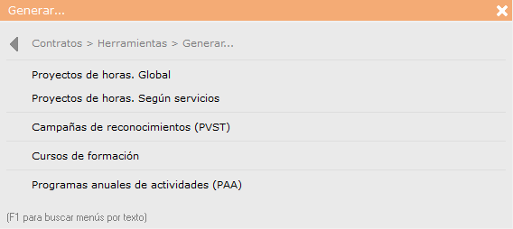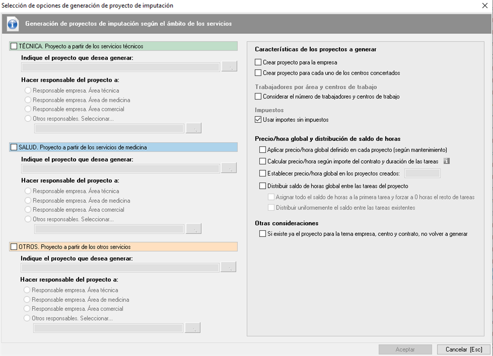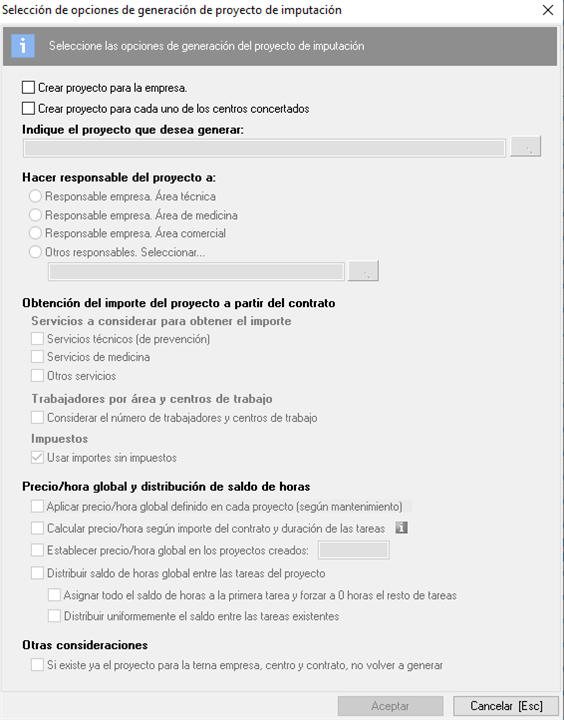 Esta opción permite al usuario generar proyectos de imputación de horas de forma masiva para todos los contratos seleccionados. Cuando se usa esta herramienta aparece una pantalla de opciones como la que pueden visualizar a continuación, donde el usuario deberá seleccionar las opciones correspondientes. Es importante que en el mantenimiento de 'Proyectos predefinidos' del módulo de Horas existan proyectos predefinidos, ya que de lo contrario no se podrá utilizar esta herramienta.
