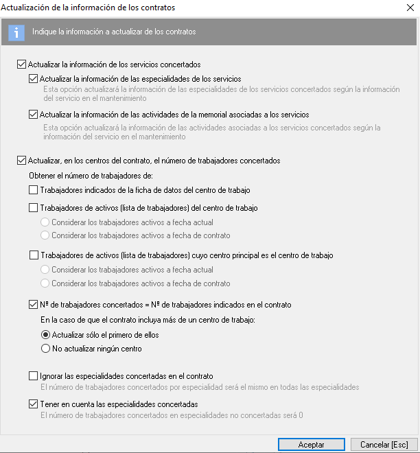 - Actualizar información de las especialidades de los servicios. Esta opción actualizará los servicios del contrato, habilitando las especialidades contratadas relacionadas con la Memoria Orden TIN, atendiendo a la configuración general de los servicios.