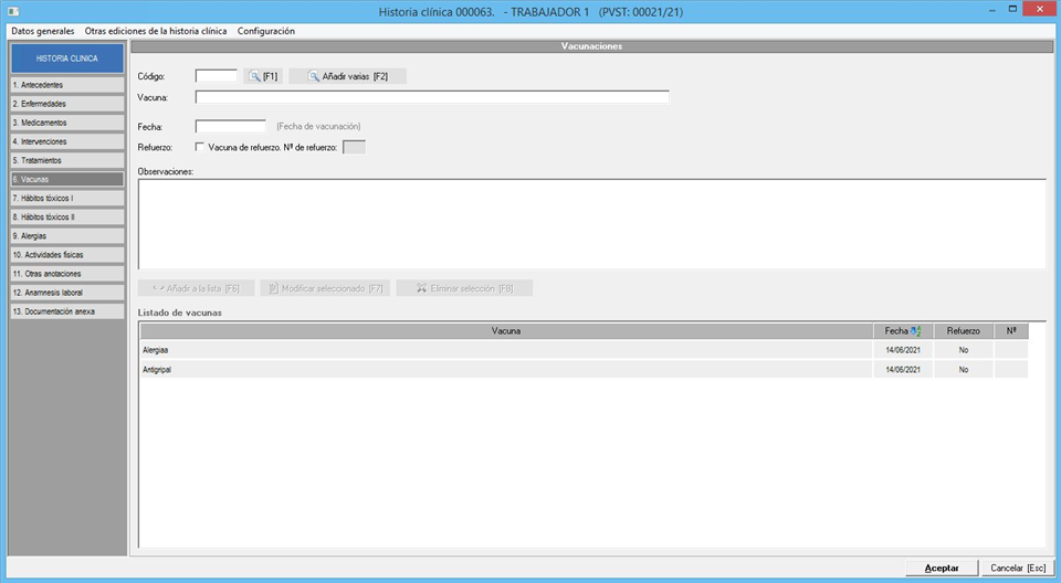 - La manera manual sería añadir las vacunas en la historia clínica, con los botones F1 y F2 que podemos ver en la imagen anterior. De esta manera, seleccionaríamos aquellas vacunas que queremos dejar registradas en la historia clínica del trabajador