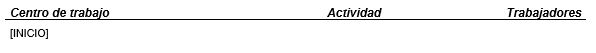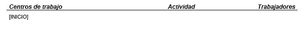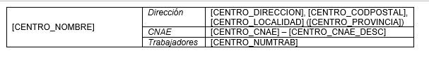 Subplantilla similar a la anterior, pero en este caso no se detalla el número de trabajadores por centro. Esta subplantilla debe incluir un único marcador [INICIO] situado en la primera columna de una tabla de 2 columnas, como en la siguiente imagen: