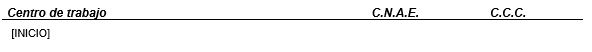 Subplantilla utilizada para mostrar el listado de centros de trabajo incluidos en el contrato, en este caso mostrando el CNAE y el CCC de los centros. Esta subplantilla debe incluir un único marcador [INICIO] situado en la primera columna de una tabla de 3 columnas, teniendo el siguiente diseño: