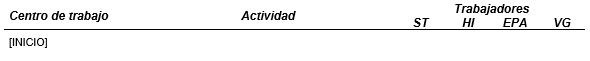 Subplantilla utilizada para mostrar el listado de centros de trabajo incluidos en el contrato, detallando el número de trabajadores cubiertos por cada especialidad. Esta subplantilla debe incluir un único marcador [INICIO] situado en la primera columna de una tabla de 6 columnas, teniendo el siguiente diseño: