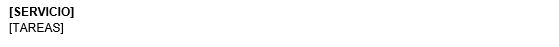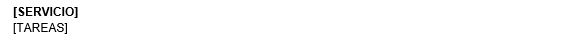 Esta subplantilla se utilizará para mostrar los servicios excluidos del contrato con el detalle de las tareas de estos servicios. Esta subplantilla debe contener el marcador [SERVICIO] y el marcador [TAREAS] dentro de una tabla con dos filas y una columna, teniendo el siguiente diseño: