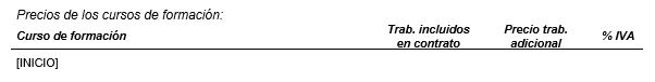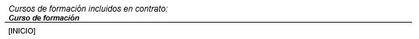 Subplantilla utilizada para mostrar la relación de cursos de formación incluidos en el contrato. Sólo se incluirán aquellos cursos en los que no se haya indicado una tarifa individual para los trabajadores adicionales, con el siguiente diseño:
