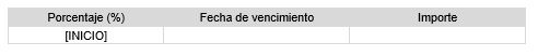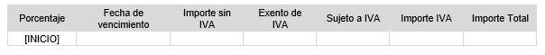Subplantilla utilizada para mostrar listado de pagos del contrato, en un formato básico, siempre y cuando se haya usado la modalidad de Fraccionamiento de pagos por porcentajes. Esta subplantilla debe incluir un marcador [INICIO] situado en la primera columna de una tabla de 3 columnas, con un diseño similar al siguiente: