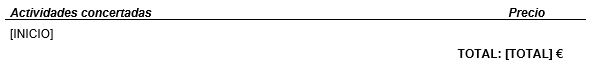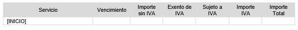 Subplantilla para mostrar el resumen de los servicios incluidos en el contrato cuyo importe sea 0. Esta subplantilla debe incluir un marcador [INICIO] situado en la primera celda de una tabla de 1 columna, teniendo el siguiente diseño: