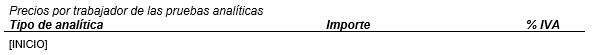 Subplantilla utilizada para mostrar las tarifas por trabajador de las pruebas analíticas. Debe contener un marcador [INICIO] situado en la primera celda de una tabla de 3 columnas, teniendo el siguiente diseño:
