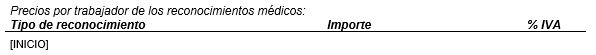 Subplantilla utilizada para mostrar las tarifas por trabajador de los reconocimientos médicos. Debe contener un marcador [INICIO] situado en la primera celda de una tabla de 3 columnas, teniendo el siguiente diseño: