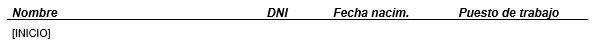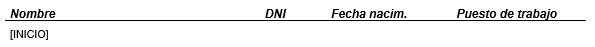 Subplantilla utilizada para mostrar el listado de trabajadores de los centros de trabajo incluidos en el contrato. Esta subplantilla debe incluir un único marcador [INICIO] situado en la primera columna de una tabla de 4 columnas, teniendo el siguiente diseño: