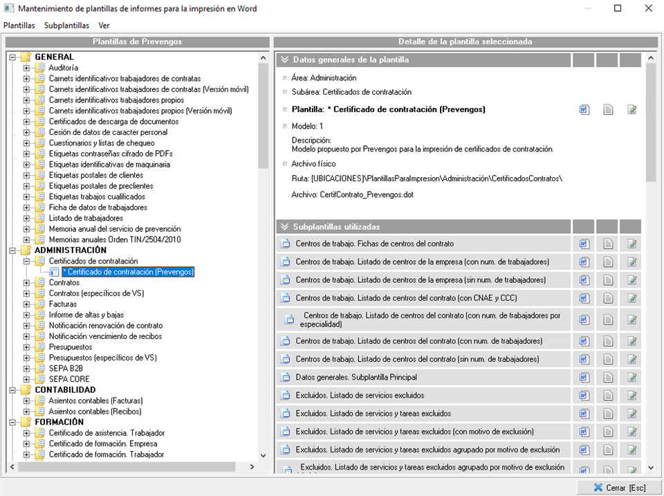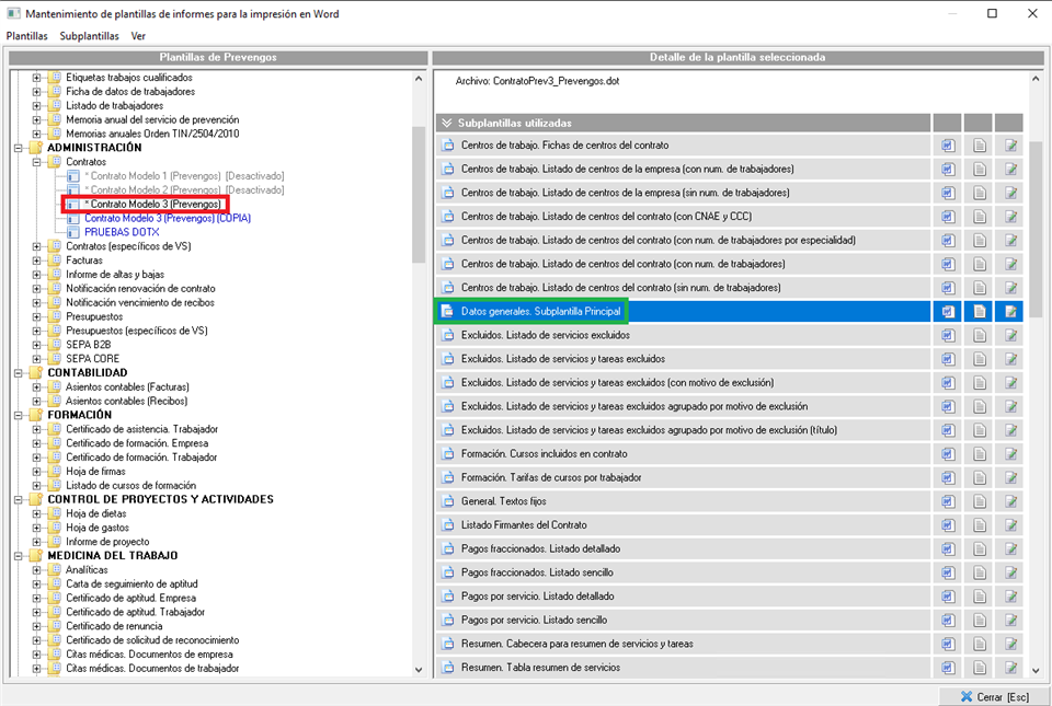 - Prevengos usará las subplantillas que necesite para montar el documento completo, es probable que haya subplantillas que no utilice. Esto dependerá de los datos que tenga el contrato que se imprime.