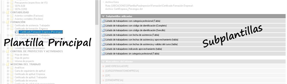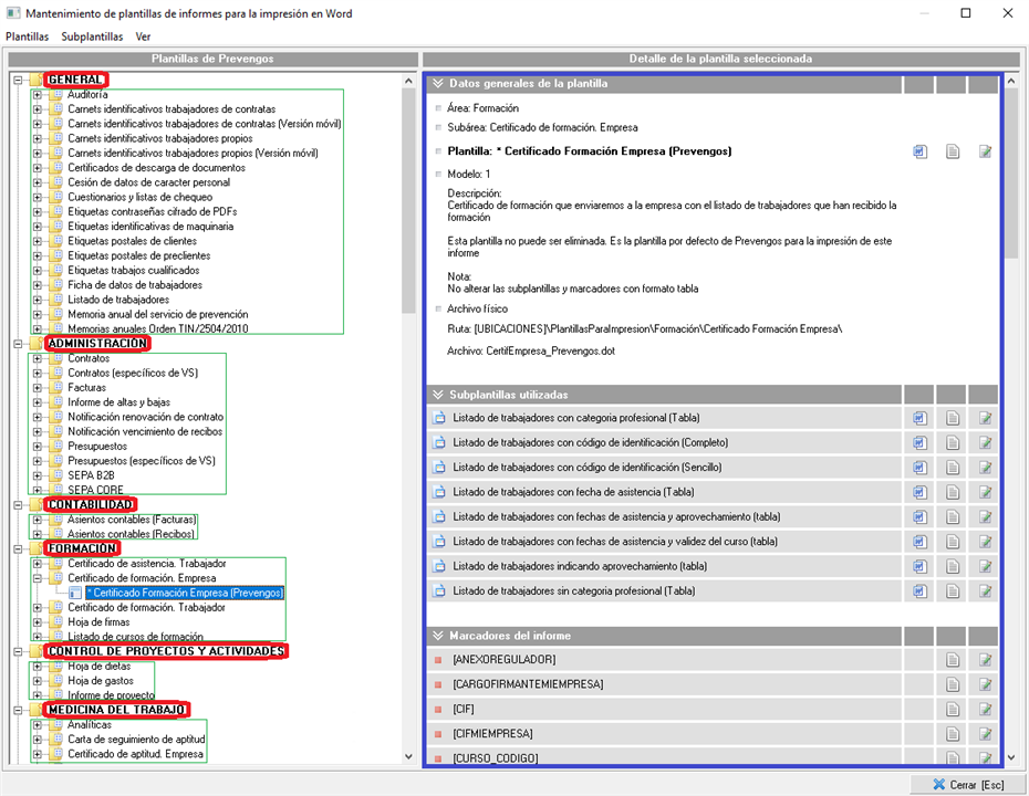Todos los informes que genera Prevengos tienen una plantilla de impresión, esta plantilla es un documento de Word sobre el que se imprimirá el informe, y este documento será en el que el usuario podrá hacer cambios para personalizar dicho informe. Cada plantilla podrá estar compuesta únicamente de una plantilla principal (un documento), y a su vez podrá tener varias plantillas Subplantillas asociadas (otros documentos de Word auxiliares).