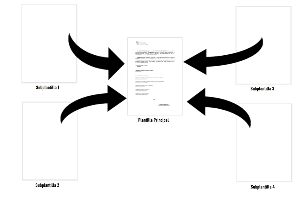 Cuando se genera el documento, Prevengos abre la plantilla principal, y la va cumplimentando, y en el caso de que haya subplantillas, en función de la configuración de impresión o los marcadores usados, las irá añadiendo sobre la plantilla principal para montar el documento.