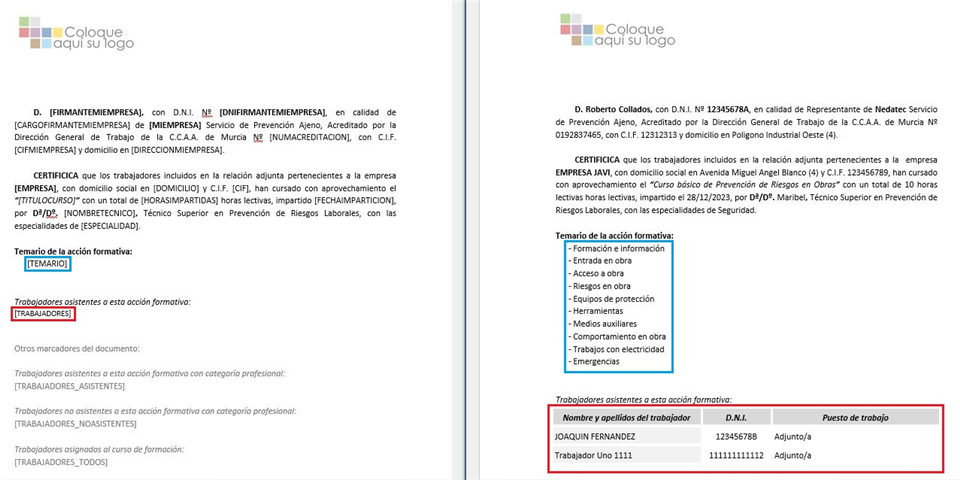 En la imagen superior podemos ver un claro ejemplo de cómo funcionan los marcadores. En la parte izquierda tenemos la plantilla de impresión y en la parte derecha tenemos el documento final. Podemos apreciar, cómo se han sustituido los marcadores por el dato que correspondiente del informe que se está imprimiendo. En el caso del marcador [TEMARIO], se ha sustituido por el texto definido en el campo correspondiente del curso.