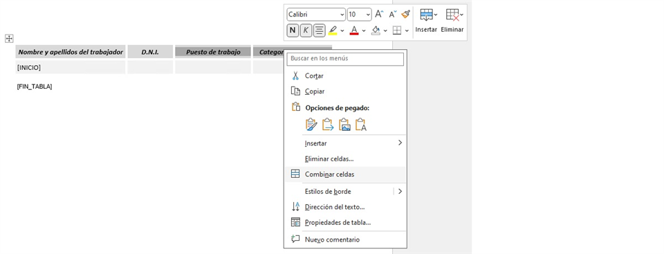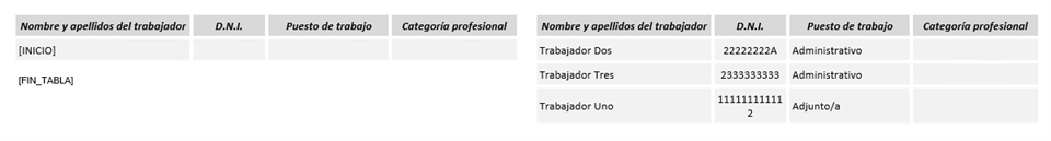 Como podemos ver, en la parte izquierda tenemos la subplantilla donde podemos ver la tabla que se va a insertar y, en el lado derecho, tenemos el resultado de la tabla una vez hemos generado el documento. Como podemos observar en la plantilla, sólo hay un marcador [INICIO] en la primera celda de la primera columna. Este marcador marca el inicio de impresión de este listado, y está preparado para insertar exactamente las columnas que aparecen en la plantilla (nombre del trabajador, DNI, puesto y categoría profesional), por lo que no es posible que el usuario cambie el marcador de sitio, que modifique el orden de los campos, ni tampoco que añada o quite columnas de la tabla, ya que si realiza alguna de estas acciones, la tabla no se rellenará correctamente.