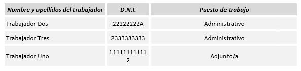 Por otra parte, el marcador [TRABAJADORES] se ha sustituido por una tabla, la cual proveniente de otra subplantilla (en caso del listado de trabajadores). Visualmente, en el documento final, el usuario no aprecia que la tabla viene de una subplantilla, ya que en el proceso de impresión, la subplantilla que contiene esta tabla, se inserta en la plantilla principal, dando lugar al documento final, que es lo que ve el usuario.