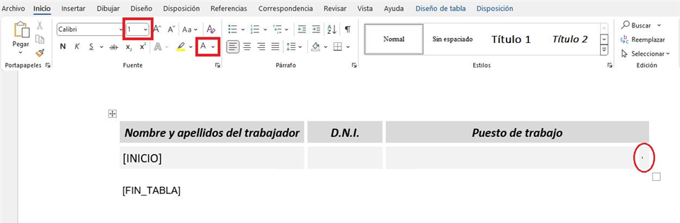 - Ocultar el contenido de la columna. Una vez tengamos la parte del encabezado solucionado, pasaremos a modificar la parte donde se van a insertar los datos. Como queremos ocultar la información de la "Categoría profesional", nos situaremos en la celda de la primera fila correspondiente a ese dato, haremos la letra lo más pequeña posible (tamaño 1), además de poner la letra en color blanco (o en el color del fondo de la celda), como podemos ver en la siguiente imagen: