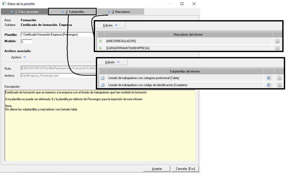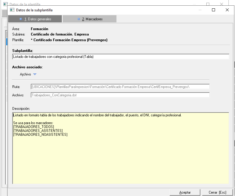 Como podemos observar, y de manera similar a la ficha de la plantilla principal, podemos ver información sobre el grupo al que pertenece, el nombre de la subplantilla (este dato no se puede cambiar) así como una descripción que nos indica que marcador, en la plantilla principal, inserta esta subplantilla. También podemos editar el documento asociado, comprobar donde está ubicado y ver sus marcadores asociados en caso de que los tenga.