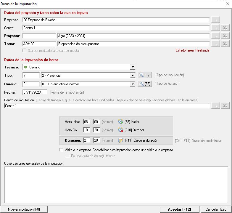 Como podemos apreciar, encontramos diferentes bloques dentro de esta ventana. El primer bloque Datos del proyecto y tarea sobre la que se imputa es meramente informativo, indicando la empresa, centro, proyecto y tarea donde se está realizando la imputación.