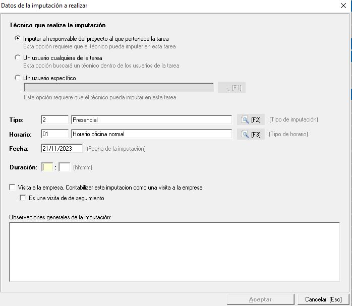 - Imputar al responsable del proyecto al que pertenece la tarea (el usuario debe poder imputar en las tareas seleccionadas)