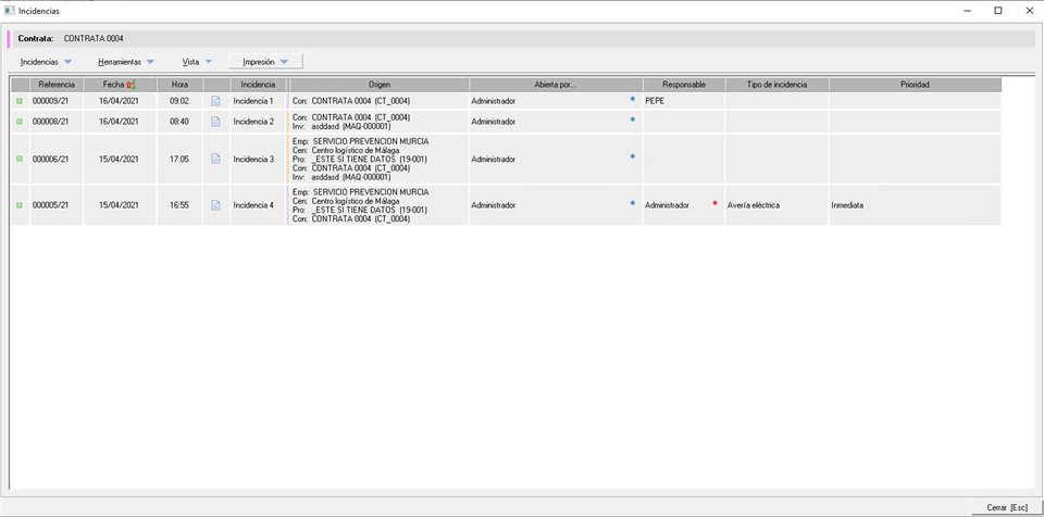 Como hemos comentado anteriormente, una vez creemos la incidencia sobre cualquier elemento (empresa, centro, trabajador o inventario) se nos mostrará la pantalla principal similar a la siguiente imagen: