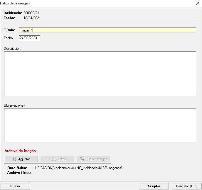 Desde el desplegable Imágenes disponemos de las opciones para insertar, editar o eliminar una imagen existente. Al usar la opción Nueva Imagen se mostrará la siguiente ventana: