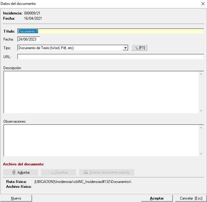 Tras cumplimentar el formulario y adjuntar el fichero aceptaremos la ventana con lo que se grabará el documento en la Incidencia.