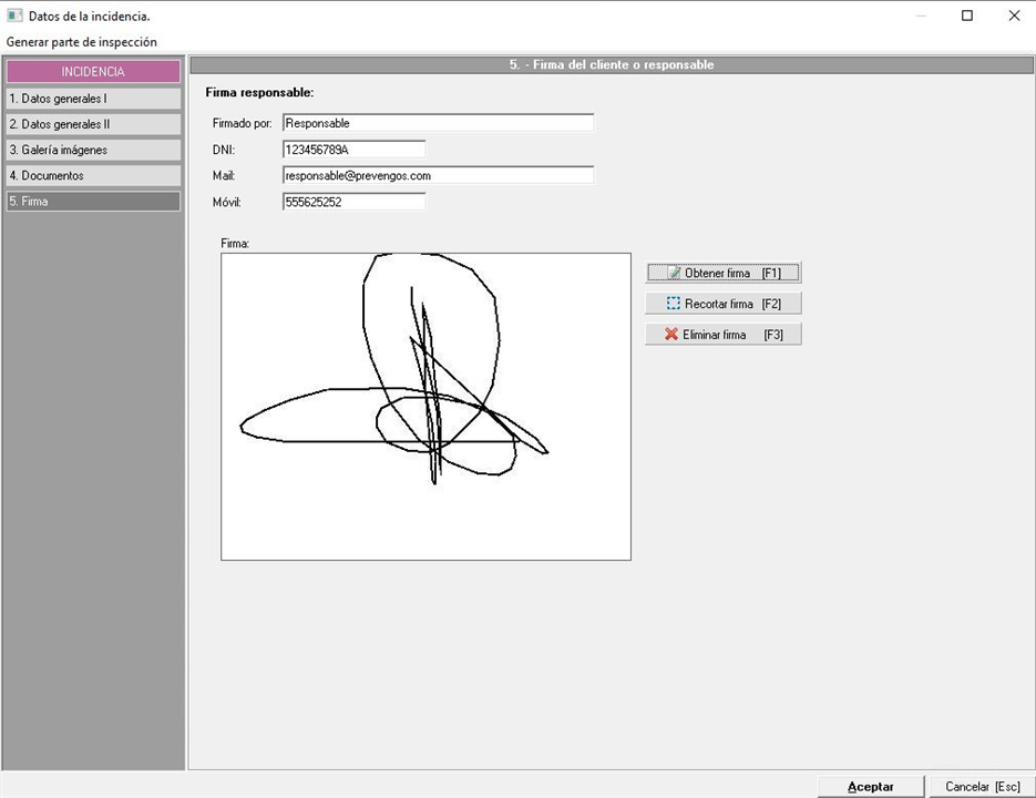 - Con el uso de la web del técnico (Prevengos Webapp), de tal manera que el técnico puede cumplimentar la incidencia directamente desde un dispositivo móvil (Tablet, móvil,...) recogiendo la firma del responsable en el propio dispositivo. De esta manera el técnico puede cumplimentar la incidencia y acercarle el dispositivo al responsable para que firme, con el dedo o con la ayuda de un lápiz digital, volcándose automáticamente la firma a Prevengos e insertandose cuando se genere el informe.