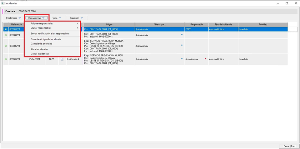 Estas opciones que tenemos en el desplegable Herramientas nos permite establecer, en las incidencias que tengamos seleccionadas, el tipo o la prioridad de la incidencia que elijamos del mantenimiento.