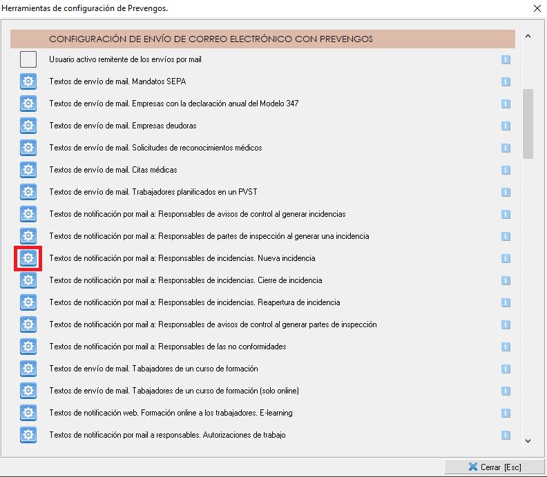 Esta notificación se envía por correo electrónico usando una plantilla que podemos personalizar, para ello debemos de acceder a la configuración de Prevengos. Esta configuración la tenemos en la pantalla principal de Prevengos -> Menú superior "Configuración" -> "Configuración de Prevengos". En la ventana que se muestra accederemos al apartado que vemos seleccionado en la siguiente imagen: