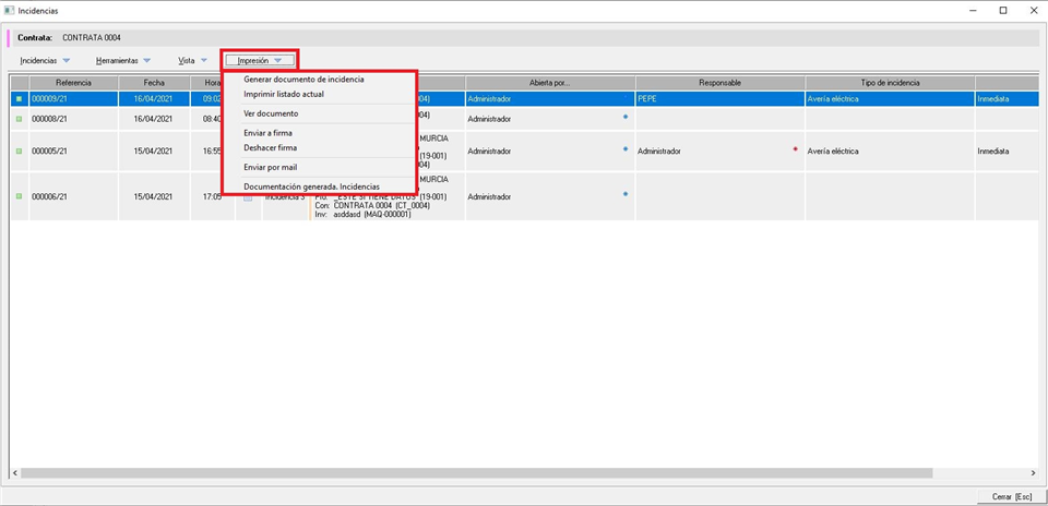 En este apartado vamos a ver las opciones disponibles en el menú Impresión dentro del apartado Incidencias.