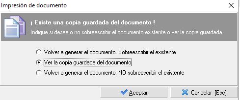 - Volver a generar el documento. No sobrescribir el existente. Se genera el documento de la incidencia pero sin tocar el que ya esté generado en la carpeta de documentación. Este documento se almacena en una carpeta temporal, por lo que una vez cerremos el documento y el gestor de impresión se elimina