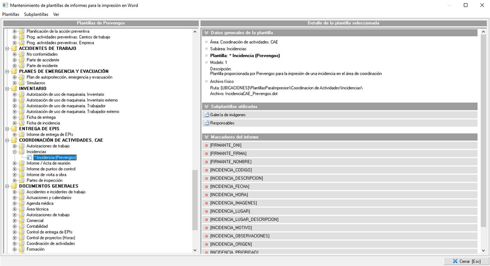El documento se genera usando una plantilla de impresión que seleccionamos en el momento de generar el informe (si solo tenemos una plantilla la coge automáticamente). Estas plantillas las encontramos en el mantenimiento de plantillas, llamado "Plantillas de Impresión de Documentos de Word" situado en el menú superior "Documentos y cuestionarios" de la pantalla principal de Prevengos. La plantilla correspondiente a las incidencias la vemos resaltada en la siguiente imagen: