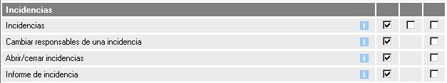 En el caso de los permisos pertenecientes a Incidencias, los que tenemos disponibles son los correspondientes a la siguiente imagen: