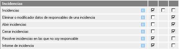 En el caso de los permisos pertenecientes a Incidencias, los que tenemos disponibles son los correspondientes a la siguiente imagen: