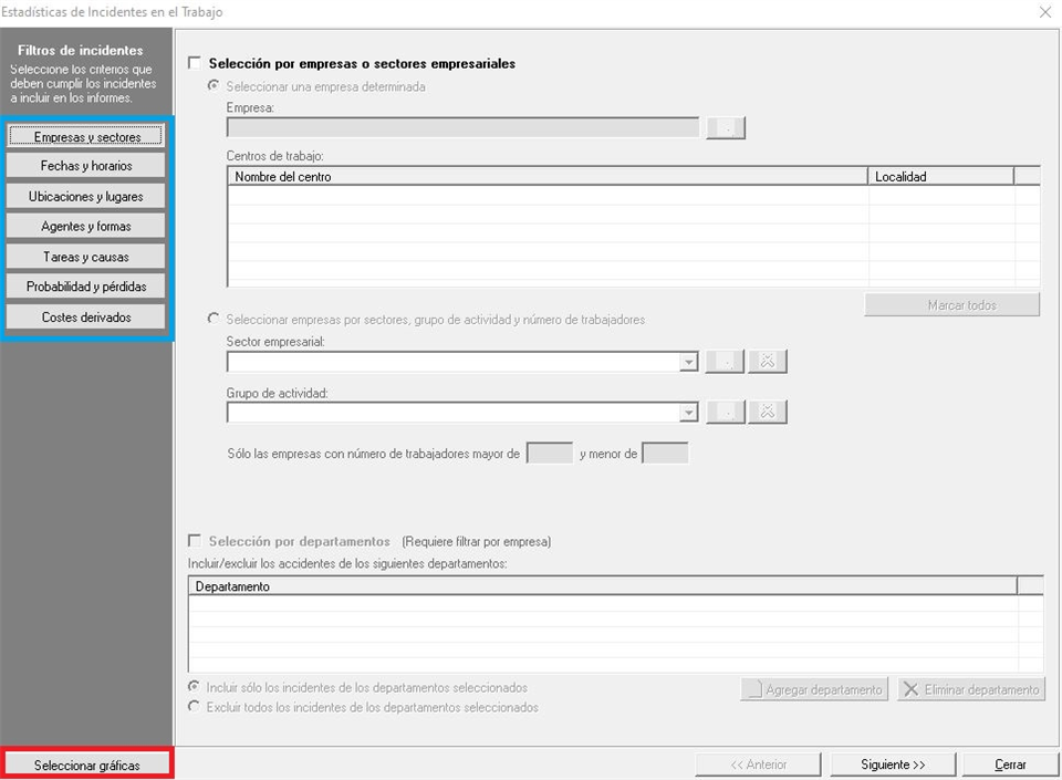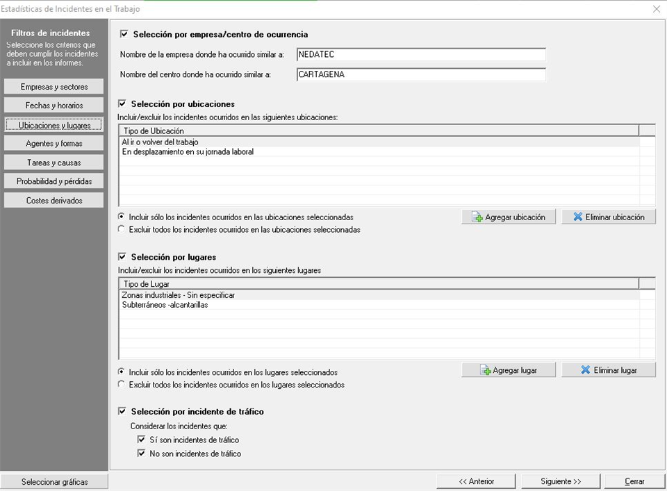 Dentro de esta pestaña aplicaremos una selección de filtros sobre las empresas donde ha ocurrido, ubicaciones y lugares donde se hayan registrado los accidentes, así como incluir, o no, los accidentes de tráfico. La pantalla que se muestra es similar a la siguiente imagen: