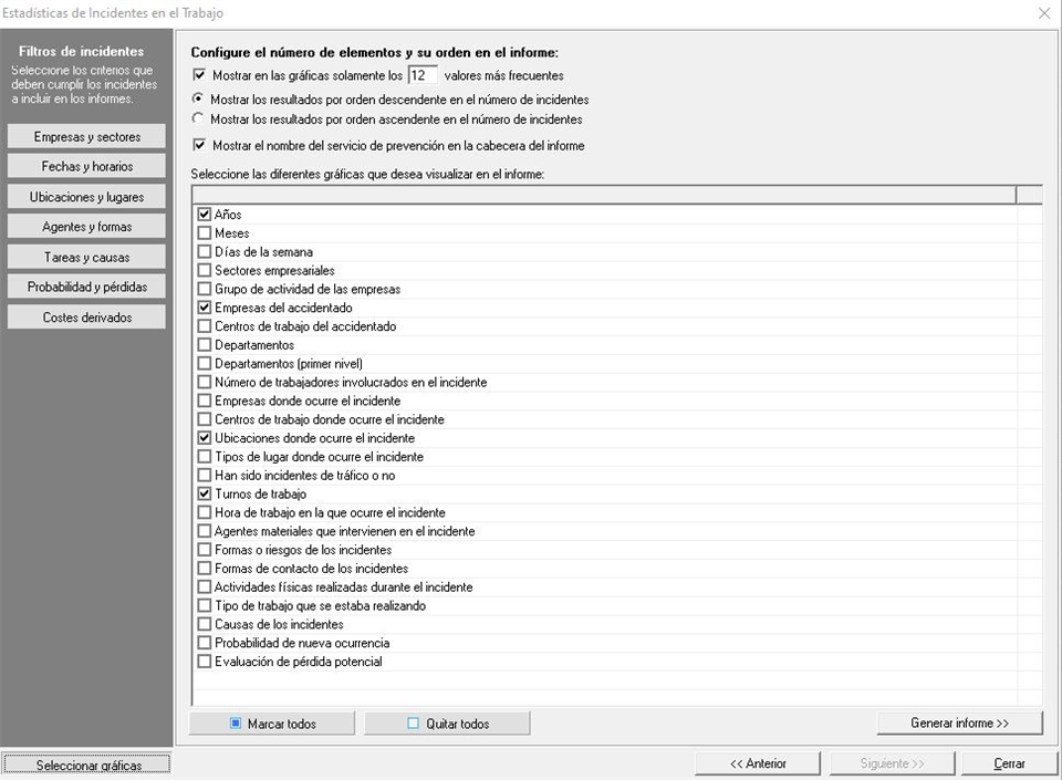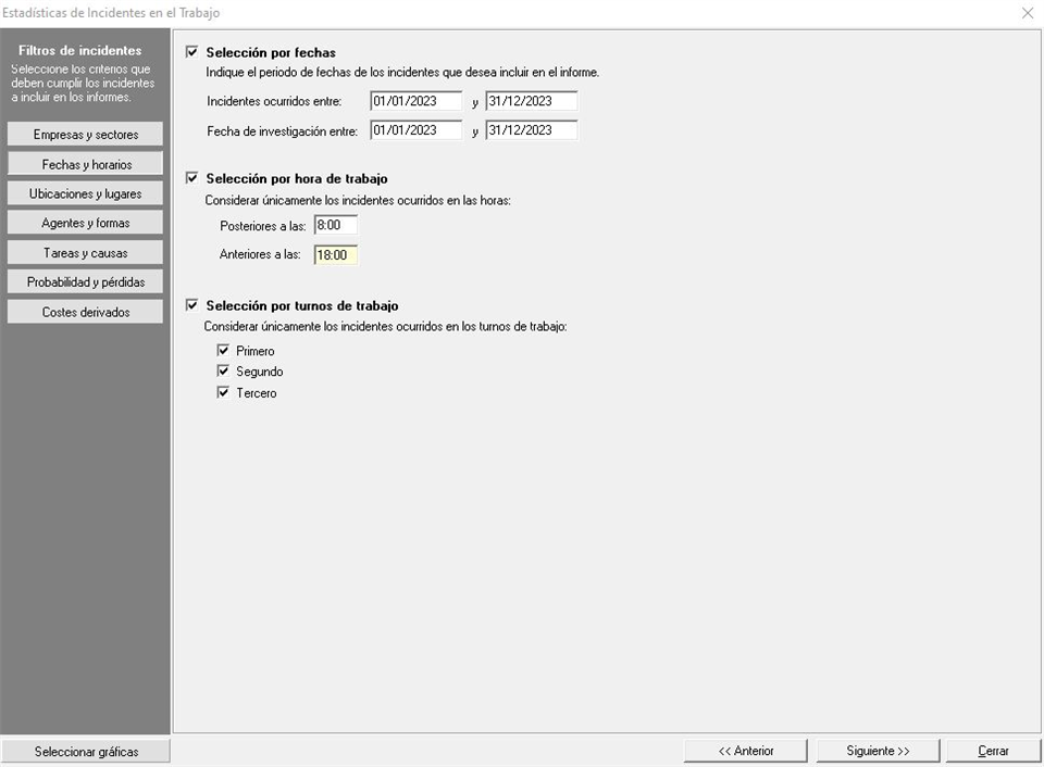 Por último encontramos la Selección de turnos de trabajo donde podemos considerar únicamente los incidentes ocurridos en los turnos de trabajo "Primero", "Segundo" y/o "Tercero", discriminando aquellos incidentes que hayan ocurrido en los turnos no seleccionados.