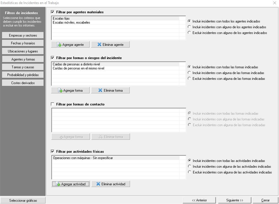 Dentro de esta pestaña podemos aplicar filtros sobre agentes materiales, formas/riesgos del incidente, formas de contacto o actividades físicas que han estado presentes en los sucesos ocurridos. La ventana que se muestra es similar a la siguiente imagen:
