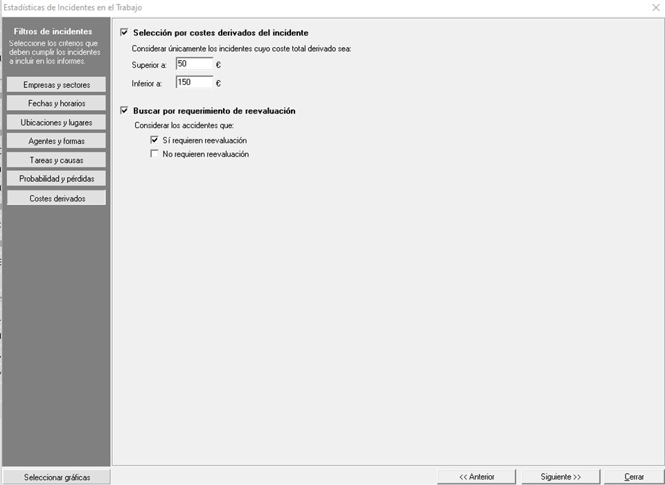 Dentro de este apartado, último que encontramos en el formulario, podemos filtrar los incidentes a tener en cuenta para el estadístico por los costes derivados o por los requerimientos de evaluación, en una ventana similar a la siguiente pantalla: