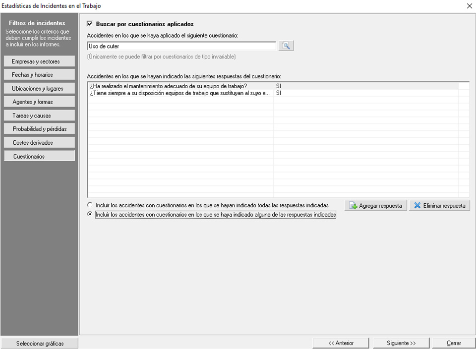 Esto no solo sirve para filtrar los accidentes a incluir en el informe estadístico, sino que también se podrán incluir en éste gráficas específicas del resultado de los cuestionarios en el propio informe mediante el Selector de gráficas, explicado más adelante en este manual: