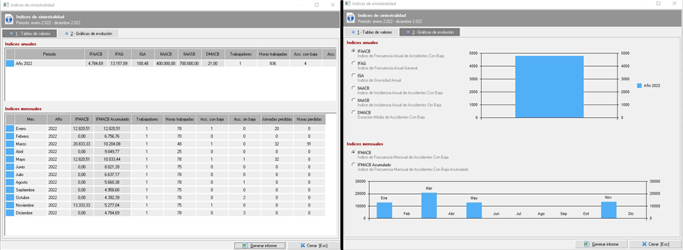 En la primera pestaña, 1. Tablas de valores, nos muestra de manera informativa los índices anuales del periodo elegido así como el desglose de los índices mensuales donde se indica el mes, año, índice de frecuencia mensual de accidentes con baja (IFMACB), el IFMACB acumulado, trabajadores, horas trabajadas, accidentes con baja, accidentes sin baja, jornadas perdidas y horas perdidas.
