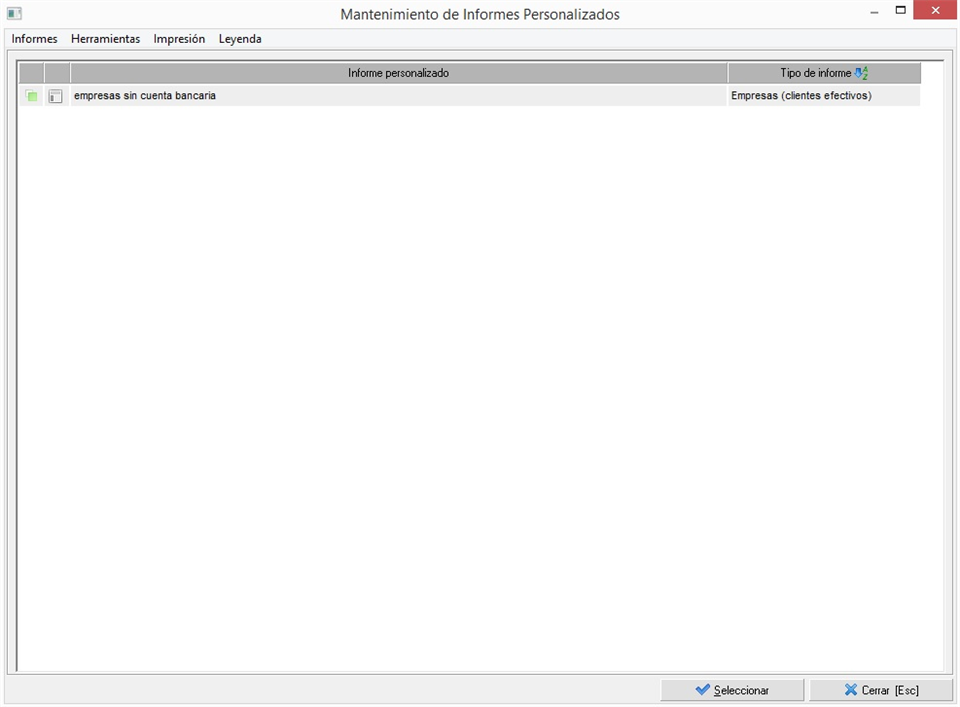 Vemos el mantenimiento de informes personalizados, donde tendremos un listado de informes que tengamos ya configurados previamente. Desde el menú superior Informes tendremos, como en todos los mantenimientos, las opciones necesarias para crear, editar y eliminar elementos. En el menú superior Herramientas tendremos la opción para modificar la plantilla asociada o de que nos muestre la descripción que tenga cada informe en su ficha. En Impresión tenemos la opción que genera el informe que tengamos seleccionado al igual que hace el boton inferior [Seleccionar]. Por último en Leyenda nos enseña el significado de cada icono, los cuales catalogan el informe dependiendo si son de empresas, preclientes, trabajadores, contratos, ...