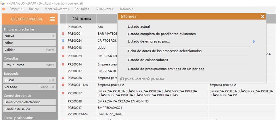 Desde la pantalla principal del módulo comercial dispone de una serie de informes con los que puede obtener listados de preclientes, fichas de datos de los mismos o listados de colaboradores y presupuestos obtenidos en un período.
